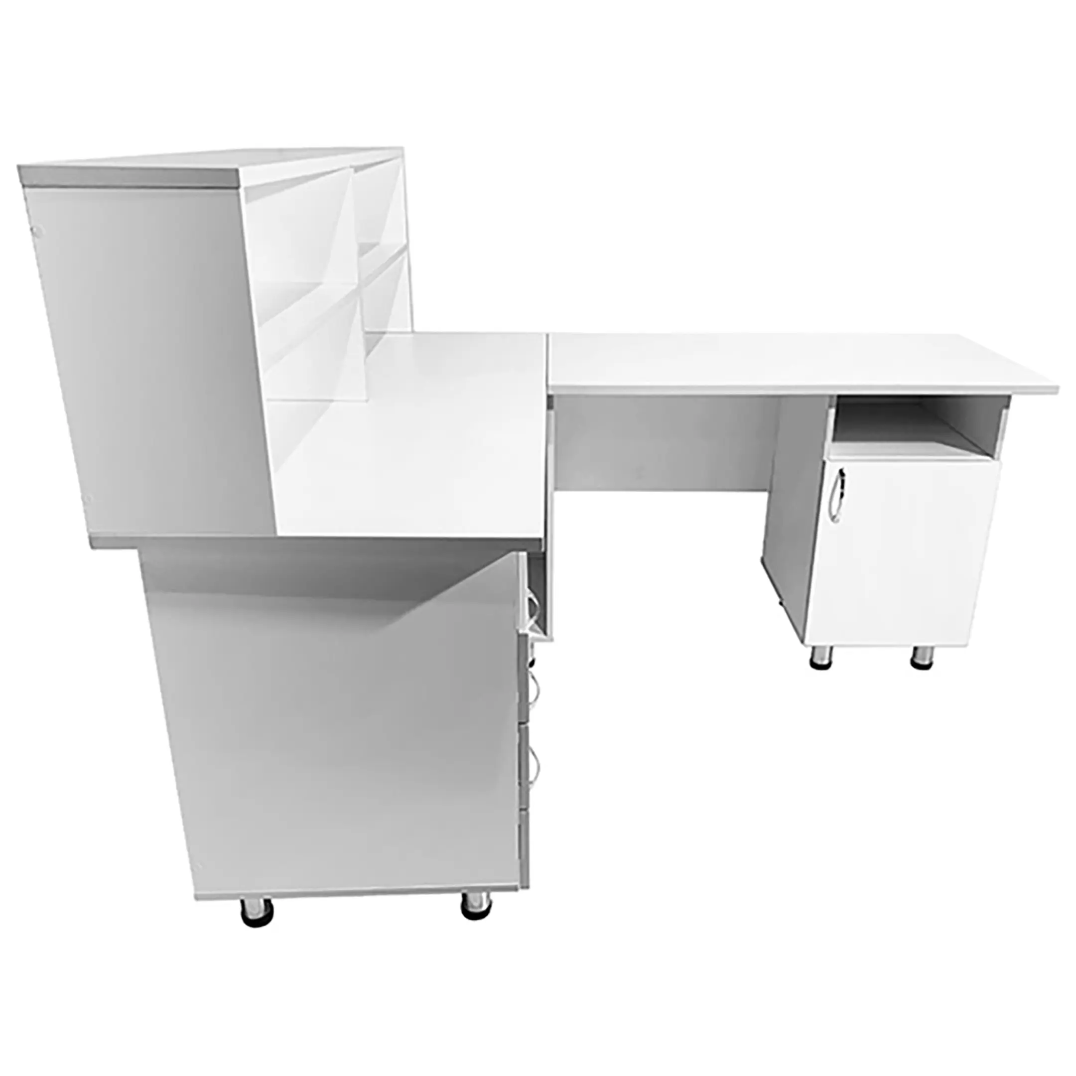 Стол-пост медицинский MD СтП 11.05 (белый) — это надежное и функциональное решение для обустройства рабочего места администратора в медицинских учреждениях. Модель выполнена из ЛДСП, имеет надстройку с полками под столешницей слева, тумбу с нишей и тремя выдвижными ящиками, а также тумбу с нишей и дверцей под столешницей справа.