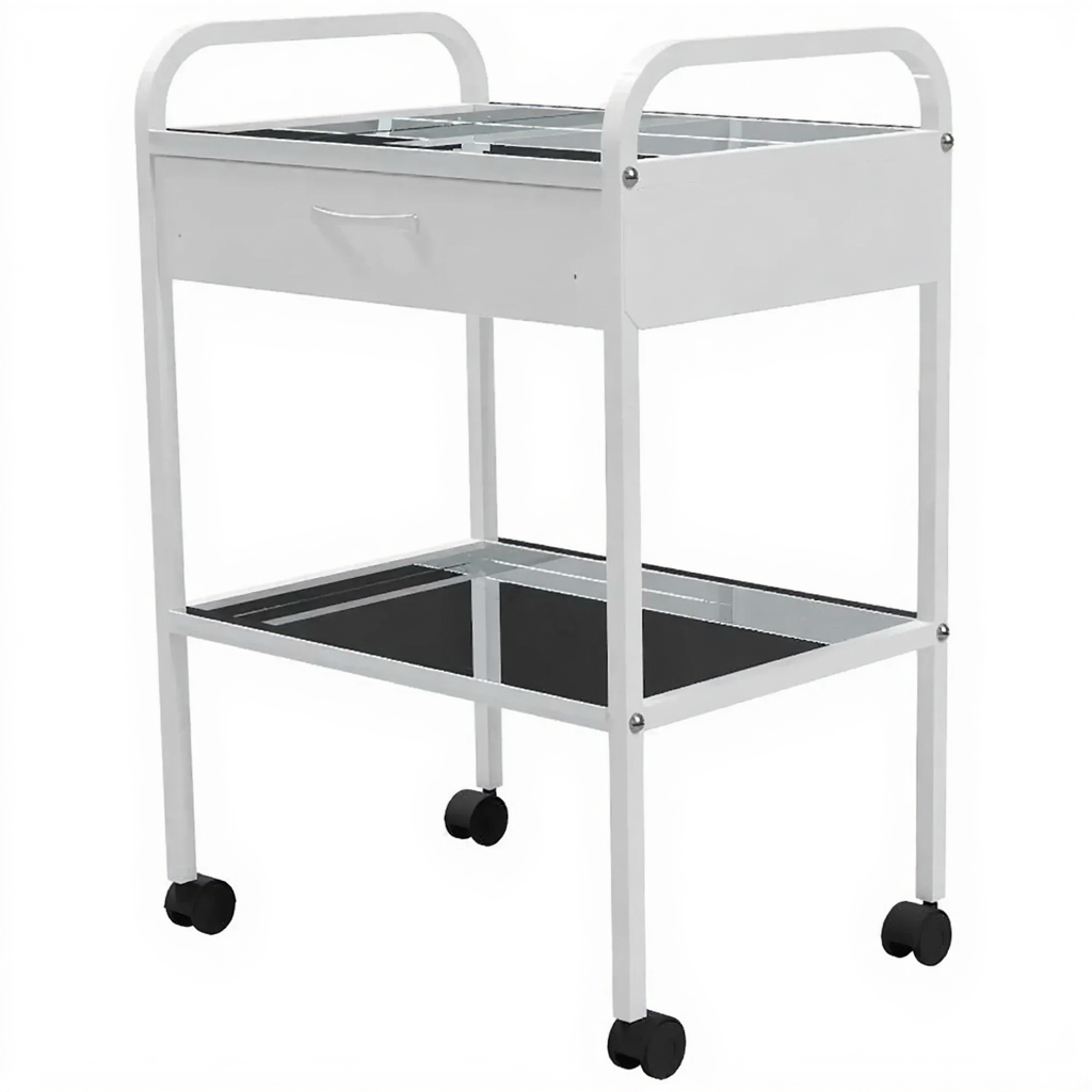 Столик медицинский инструментальный СМИ-02-01 (полки нерж. сталь + стекло, колёса серая резина) — это компактный мобильный столик, предназначенный для размещения инструмента, лекарственных препаратов и приборов в медицинских учреждениях и лабораториях. Модель имеет каркас из профильной стальной трубы, комбинированные полки (нержавеющая сталь и стекло) и один выдвижной ящик.