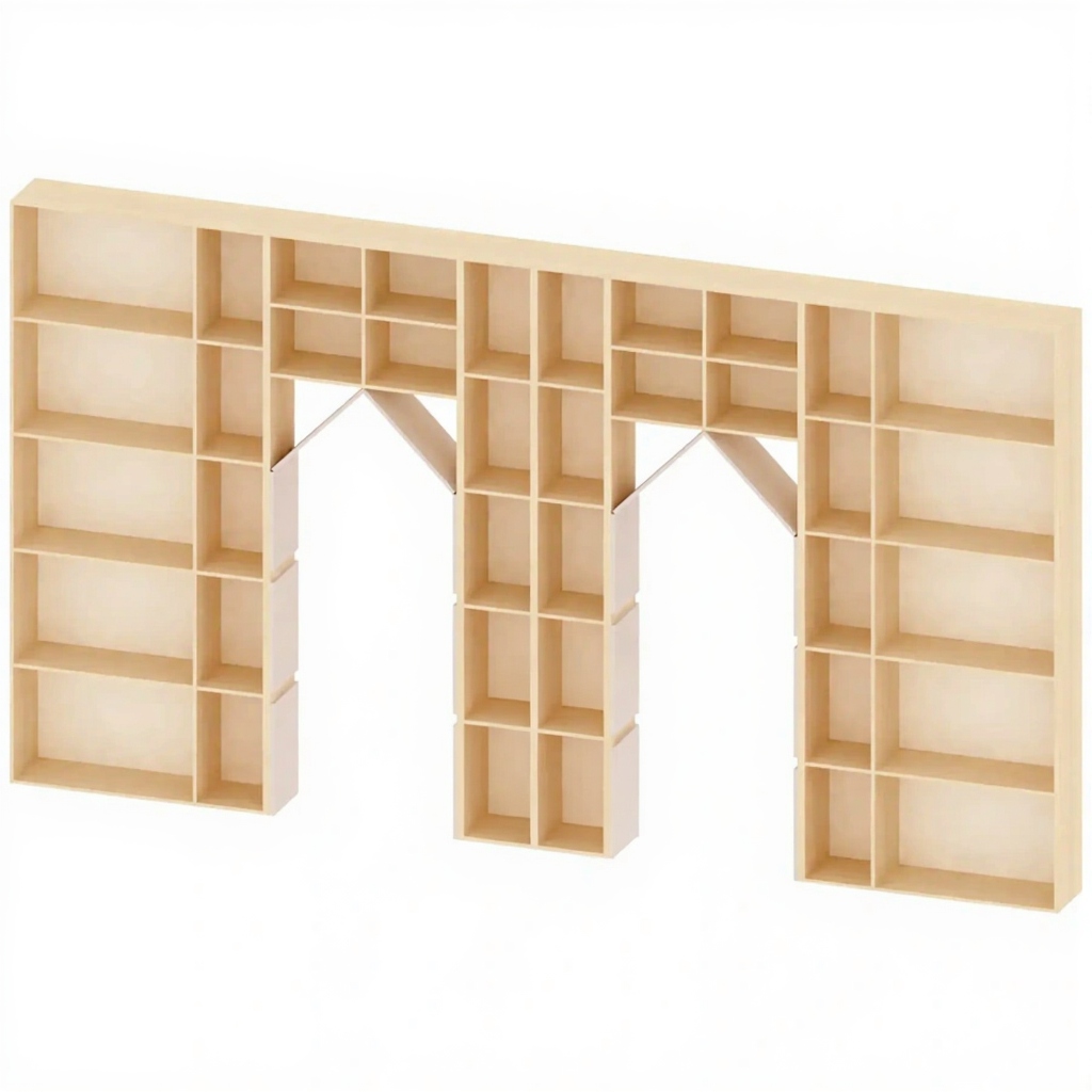 - Совмещение хранения и игровых функций — вместительные полки и ниши предназначены для книг и пособий, а архитектурные элементы (окна, арки, вырезы) становятся частью игрового сюжета.