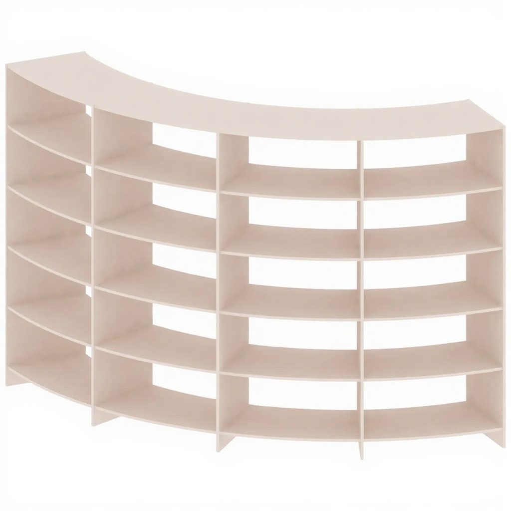 - Эстетичный и современный дизайн — плавные линии вносят в интерьер элемент динамики и современности, делая стеллаж не просто хранилищем, а выразительным предметом мебели.