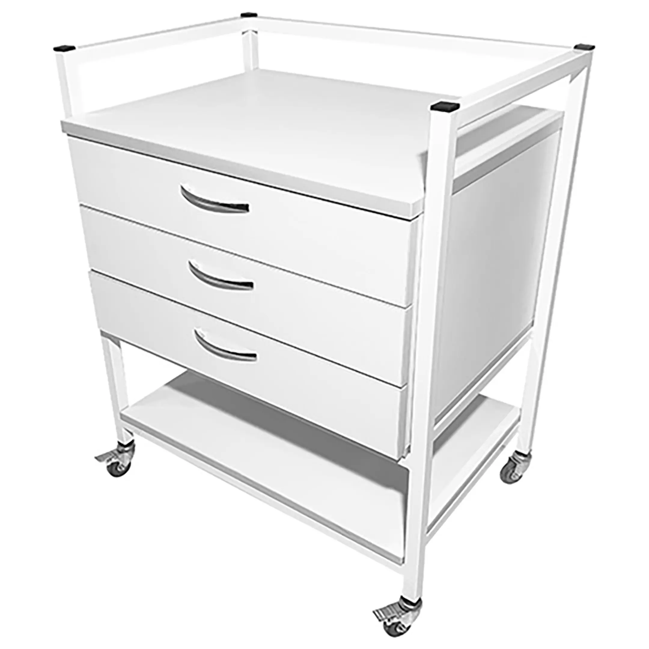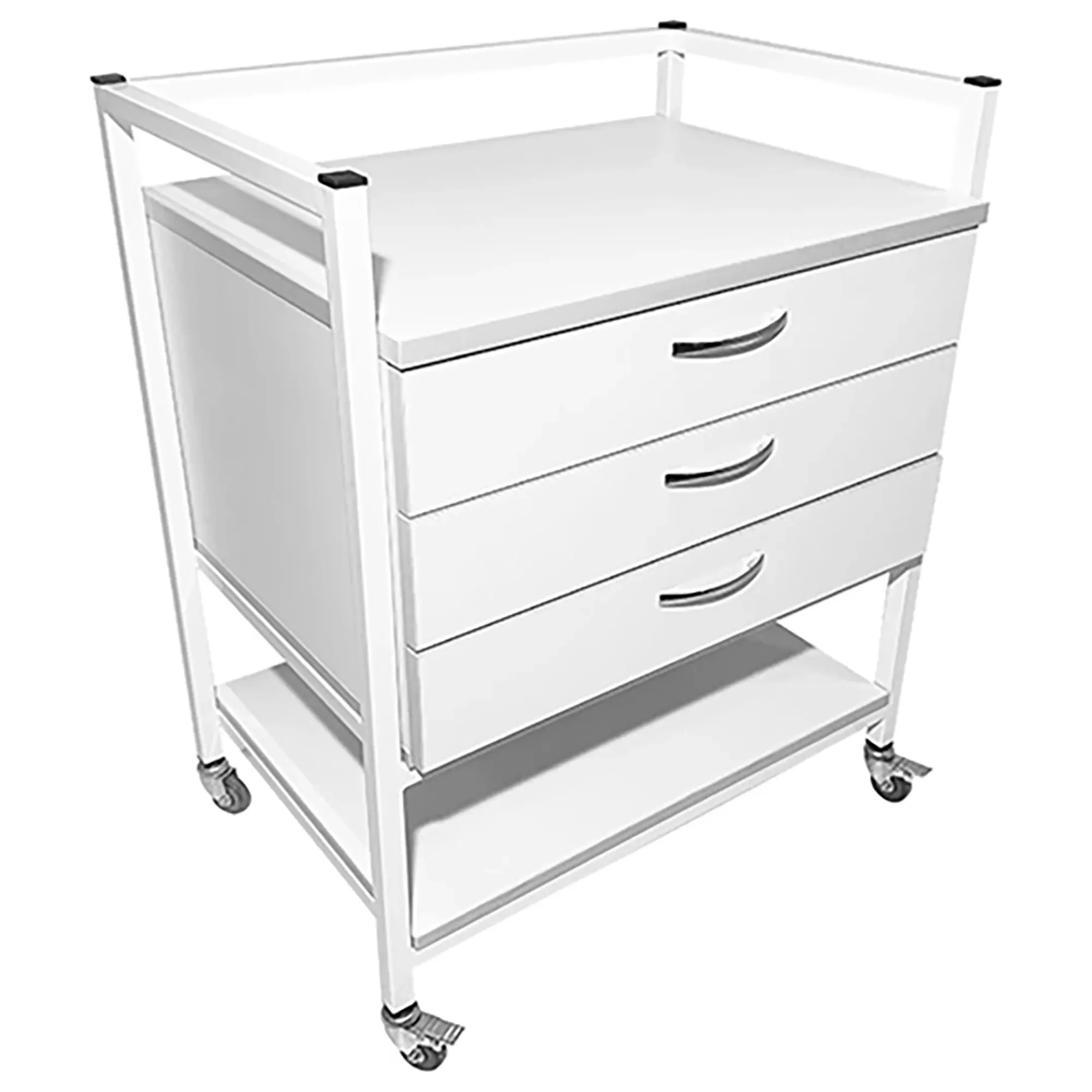 Стол лабораторный мобильный СЛм 17.003 (белый) — это надежное и удобное оборудование, которое нашло широкое применение в медицинских учреждениях и лабораториях для временного размещения и удобного перемещения различных инструментов, предметов и приборов. Модель оснащена тремя выдвижными ящиками и полкой под столешницей. Каркас выполнен из стального профиля, столешница из ЛДСП толщиной 16 мм.