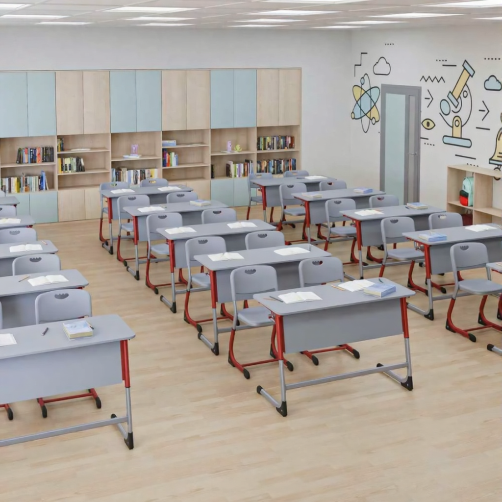 - Функциональность — просторная столешница предоставляет достаточно рабочего пространства для двух учащихся.