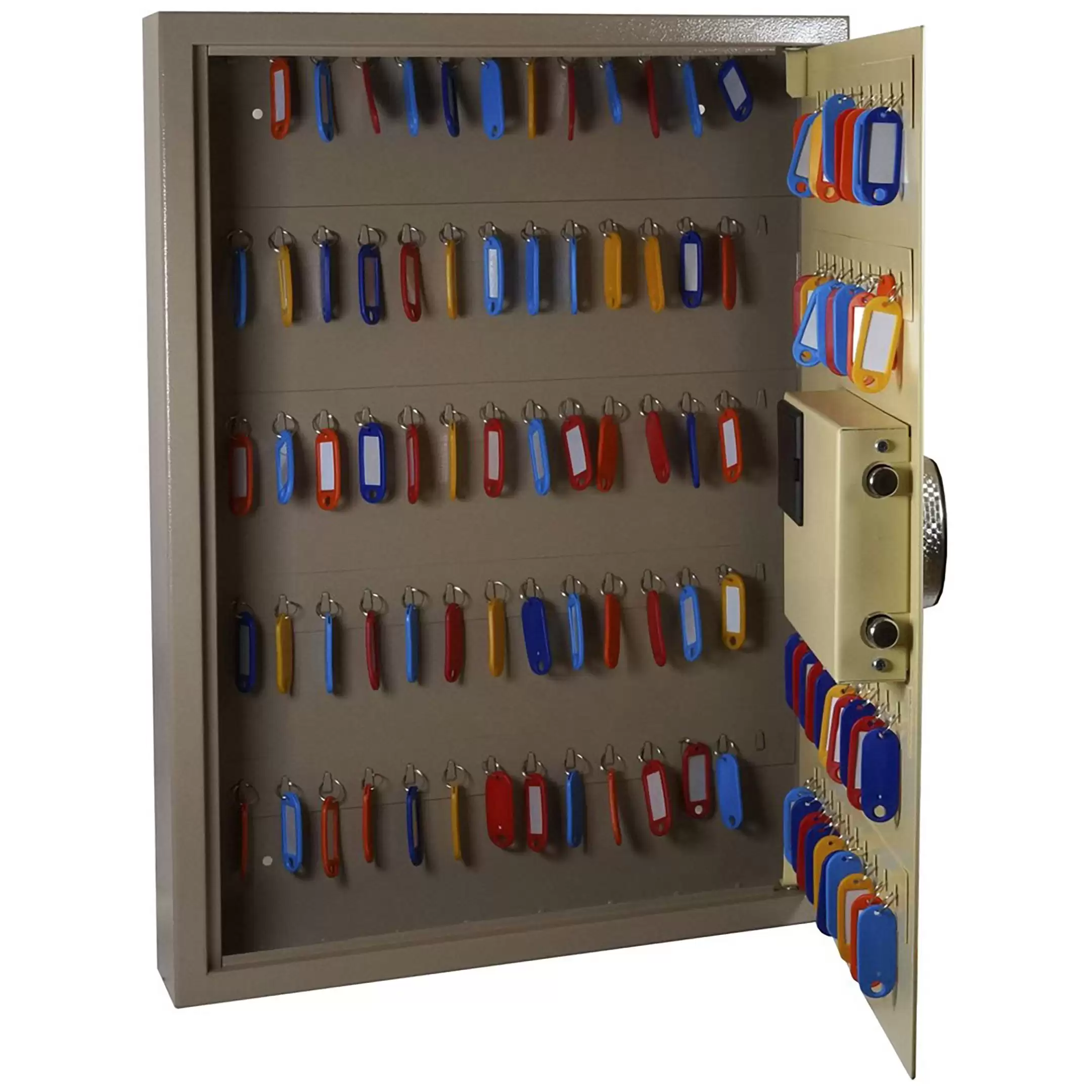 - Эргономика и удобство для ежедневной работы — модель часто оснащена выдвижной панелью, что обеспечивает компактное хранение и в то же время полный обзор и легкий доступ ко всем ключам. Комплектные брелки упрощают манипуляции, экономя время персонала и повышая эффективность работы службы безопасности или администрации.