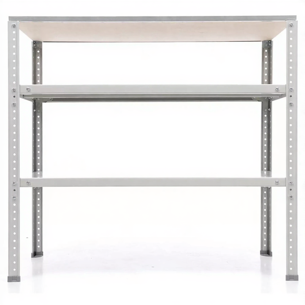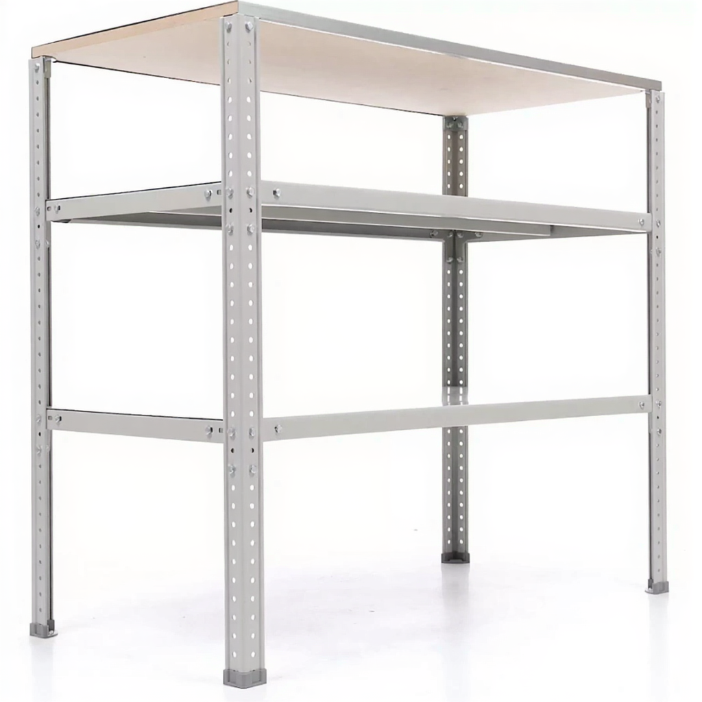 Обратите внимание: стойки верстака окрашиваются в синий цвет (RAL 5002, шагрень), а полки — в серый (RAL 7038, шагрень).