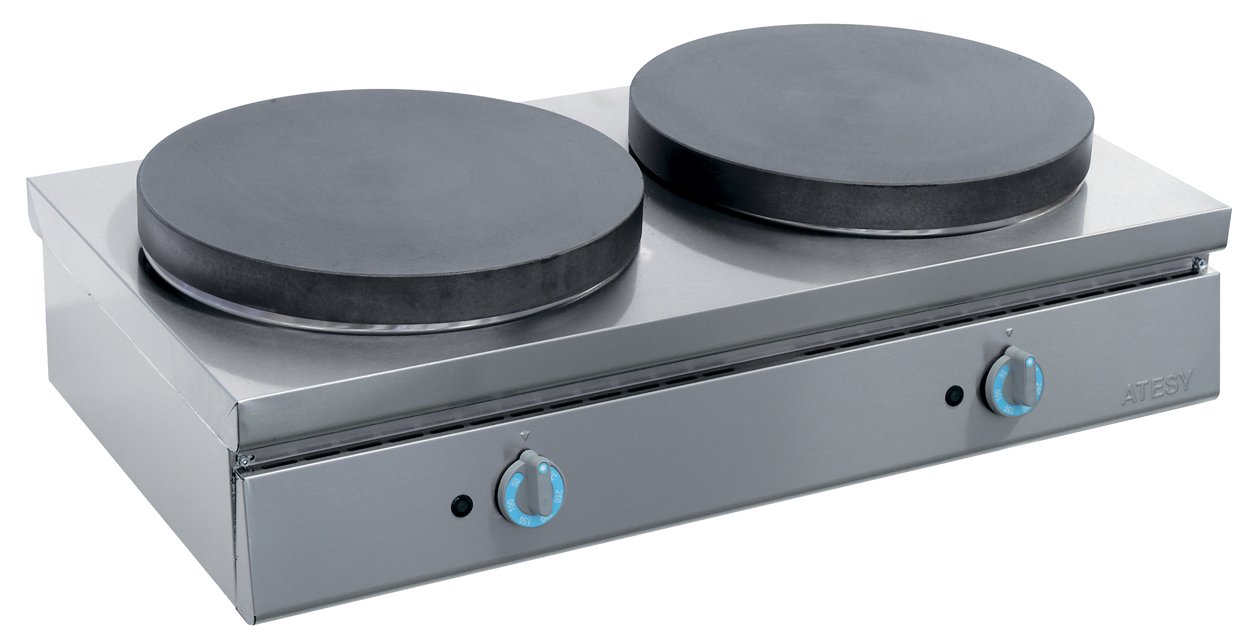 Блинница ATESY БА-2/5 «Масленица» двухконфорочная — это профессиональное оборудование для предприятий общественного питания, предназначенное для выпечки порционных блинов, блинчиков, оладий и крепов. Модель оснащена двумя чугунными жарочными поверхностями, обеспечивающими равномерный прогрев и стабильный результат.