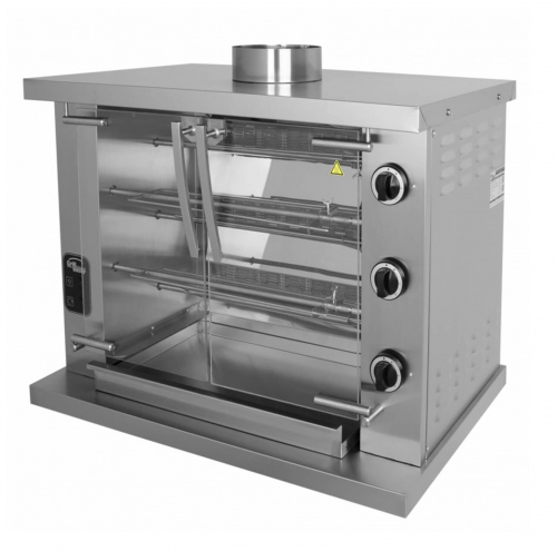 Гриль газовый Ф3У2Г — это профессиональное оборудование для предприятий общественного питания и торговли, предназначенное для приготовления целых тушек цыплят, куриных окорочков, грудок и других продуктов. Модель представляет собой газовый гриль рамной конструкции с цепной передачей вращения шампуров.