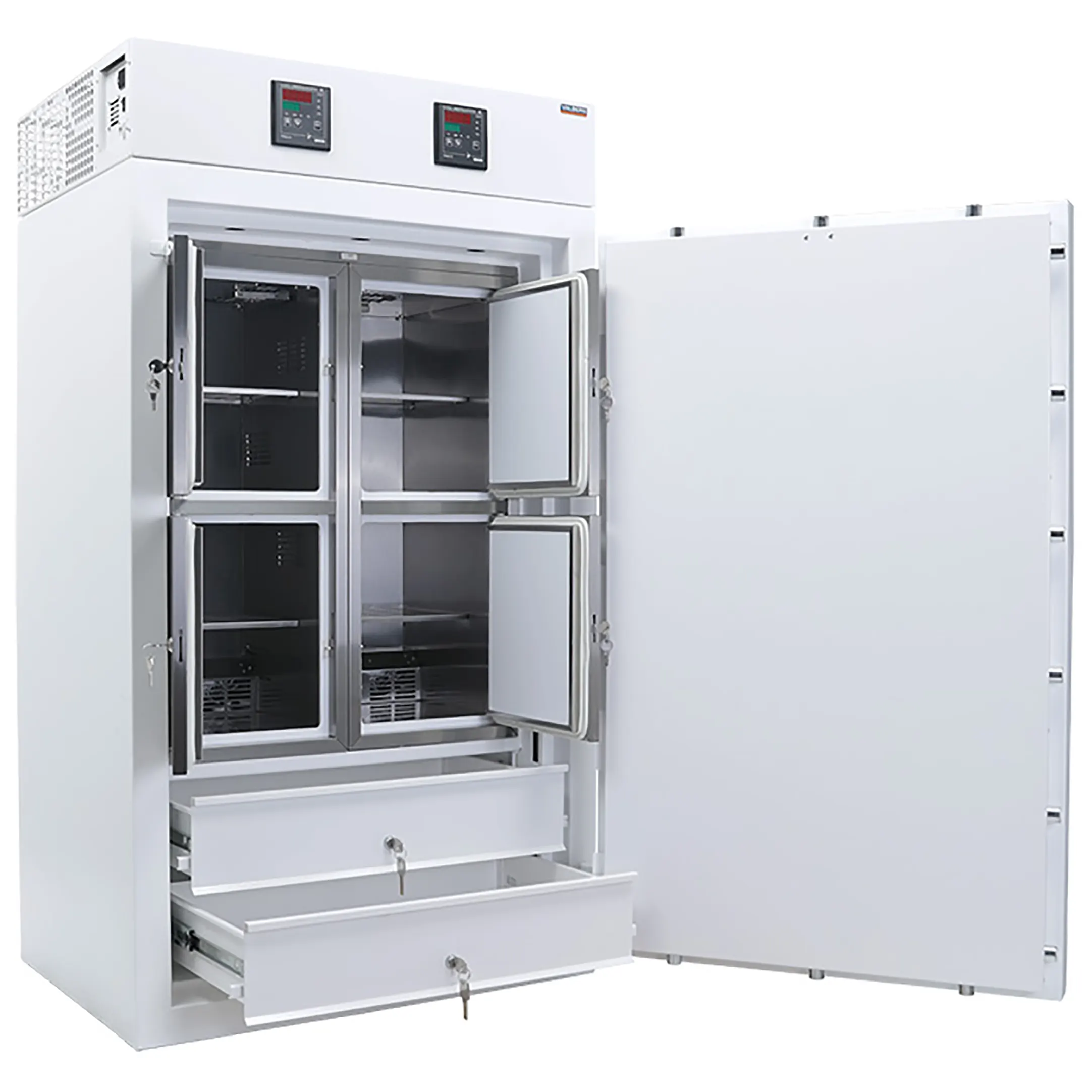 • Двумя выдвижными, индивидуально освещаемыми и запираемыми 32-ух литровыми ящиками без обеспечения тепловых режимов хранения