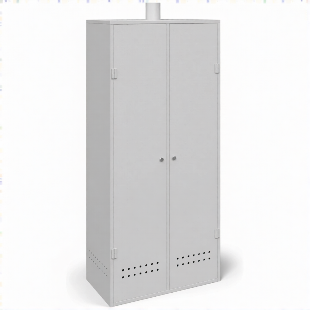 - Обеспечение требований пожарной безопасности — прочный металлический корпус служит эффективным барьером, изолирующим баллоны от возможных источников открытого огня, искр и тепла. Наличие системы приточно-вытяжной вентиляции (перфорация или вентиляционные решетки в верхней и нижней частях) обеспечивает постоянный воздухообмен, что критически важно для предотвращения образования взрывоопасной концентрации газа в случае утечки, в полном соответствии с ППР РФ.