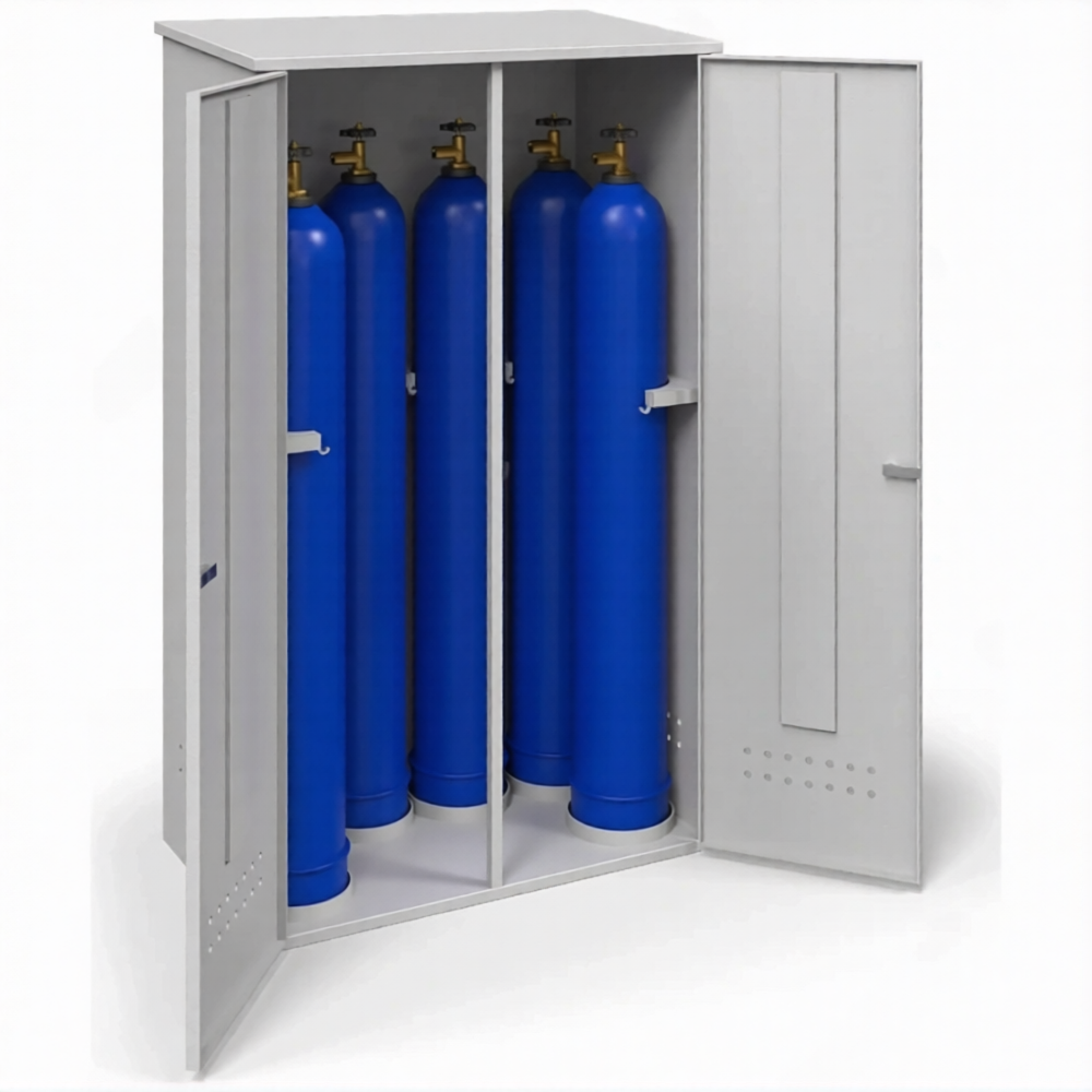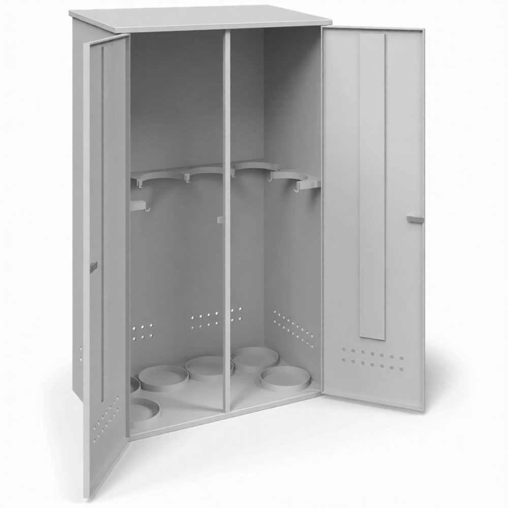 - Оптимальная вместимость и стабильная горизонтальная компоновка — шкаф рассчитан на удобное хранение шести баллонов в лежачем положении, что обеспечивает их повышенную устойчивость и удобство загрузки/выгрузки. Ширина 1040 мм и глубина 600 мм создают безопасное и просторное внутреннее пространство, исключающее повреждение баллонов друг о друга.
