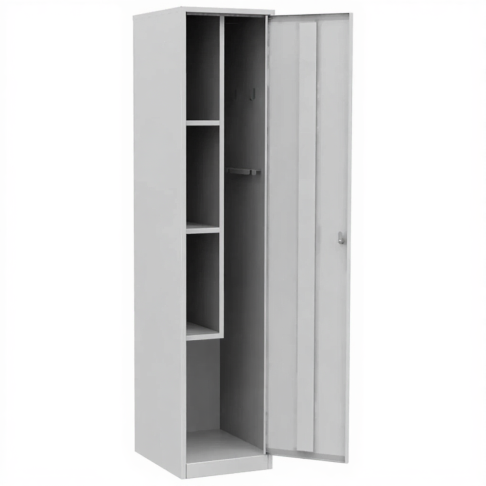 • Шкаф для хранения хозяйственного инвентаря и спецодежды имеет сварную конструкцию, изготовлен из металла толщиной 0,8 мм.