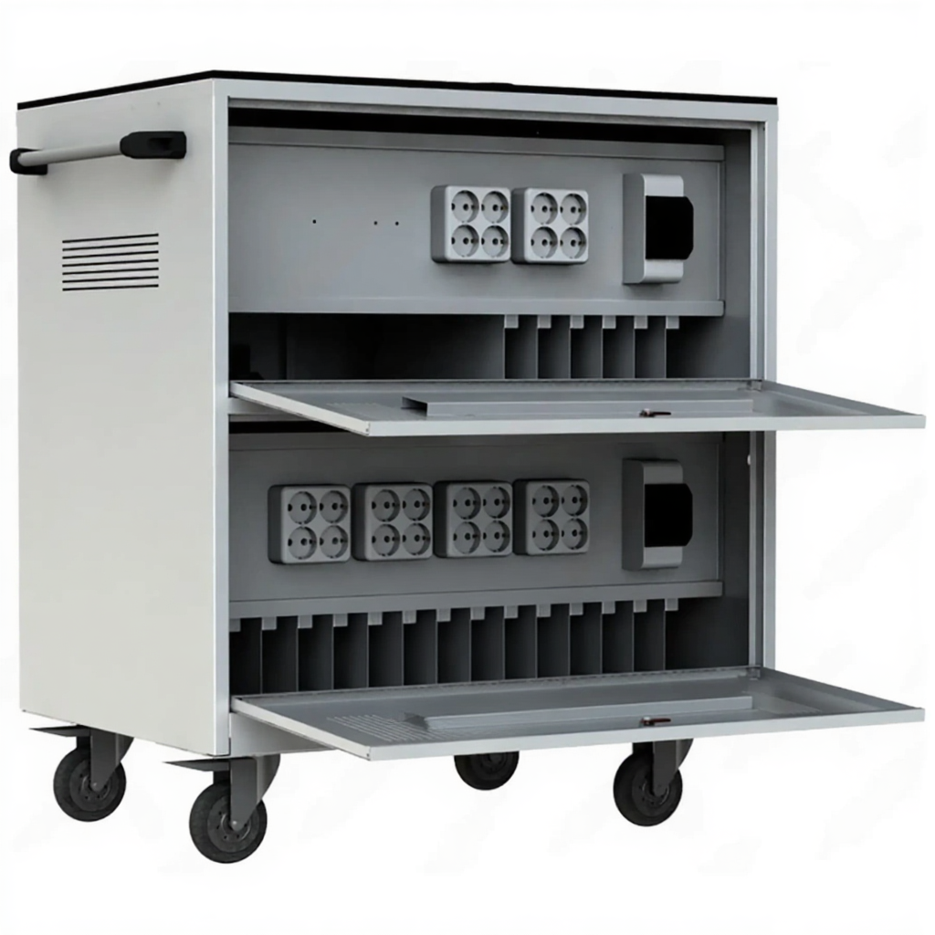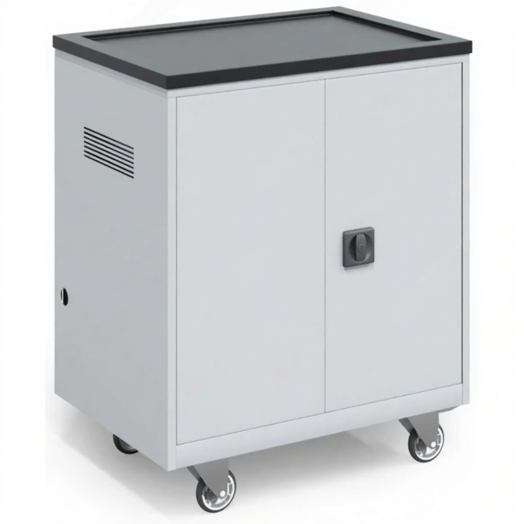 - Надежная защита и организация — прочный корпус с запирающимися дверцами защищает технику от кражи и повреждений. Каждый ноутбук имеет свое закрепленное место, что предотвращает хаос и ускоряет процесс раздачи и сбора.